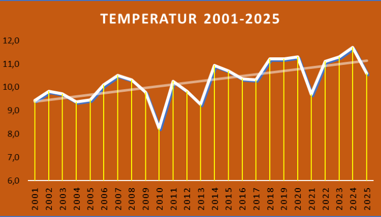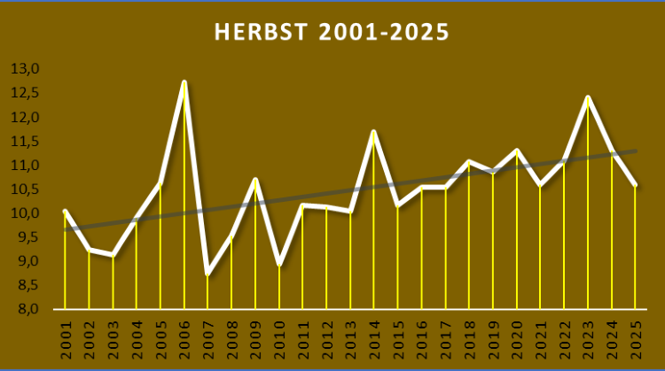 Durchschnittstemperaturwerte und Niederschlag Leipzig 2001 - 2025